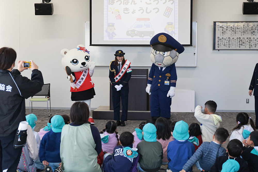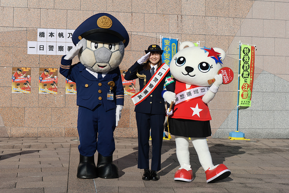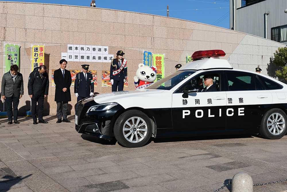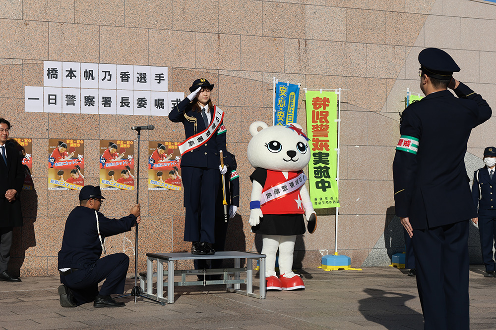 当日は市内広場で式典が行われ、一日警察署長の委嘱を受けるとともに、「防犯広報大使」にも任命されました。制服姿でパトカーや白バイなどの防犯パトロールの出発を指揮した後、市役所や警察署に移動し、特殊詐欺防止キャンペーンの呼びかけや、幼稚園児への防犯教室の講師などを務めました。