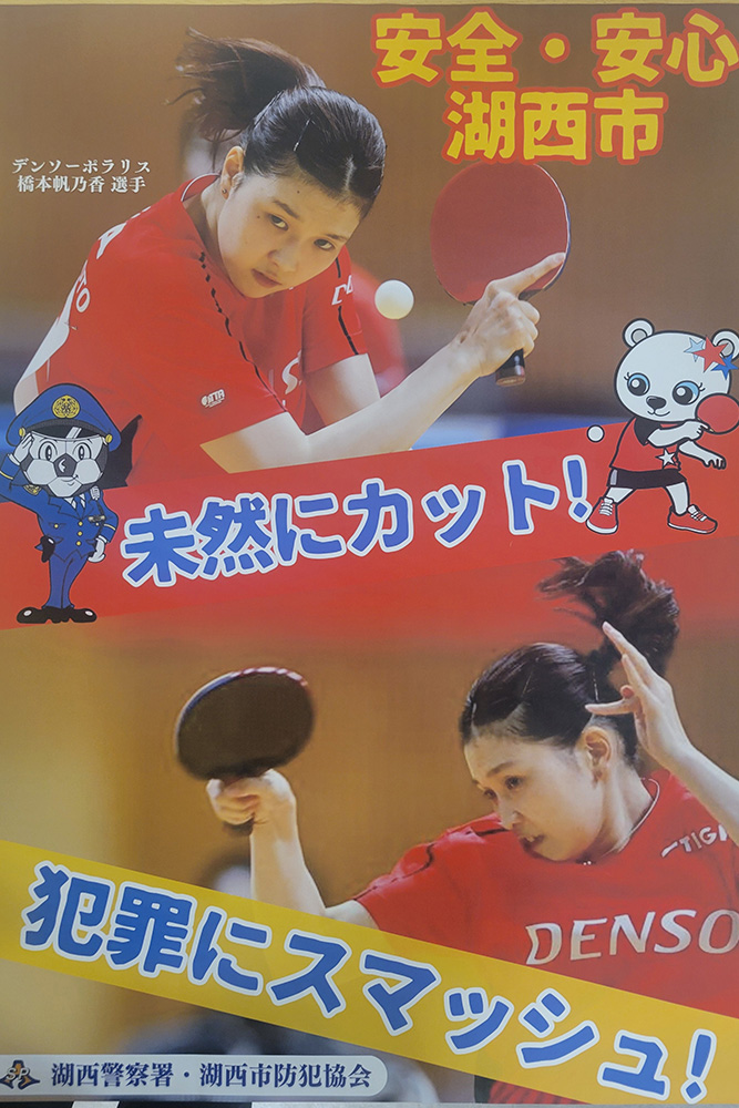 橋本選手のプレースタイルにあわせ「犯罪をスマッシュ!未然にカット!」等の標語を使用して犯罪防止広報を実施。