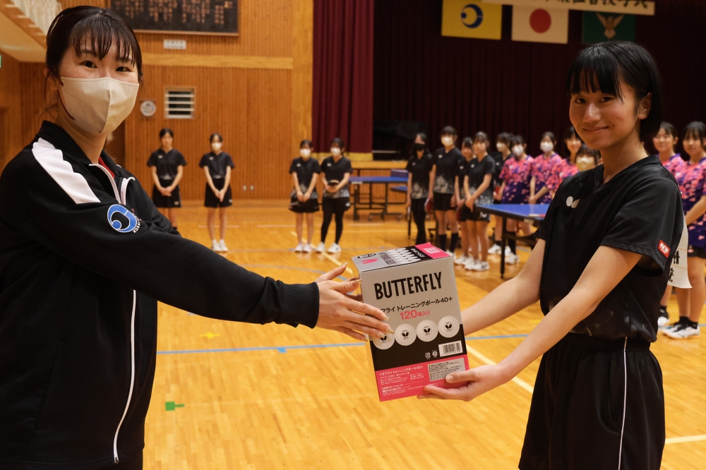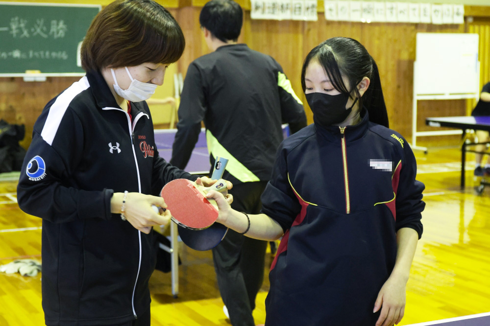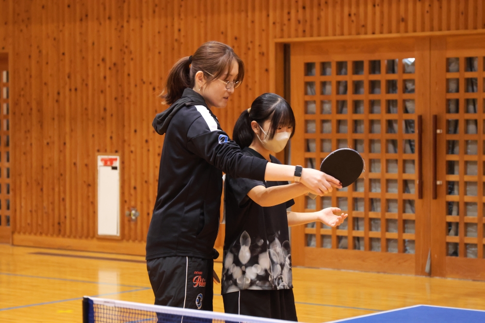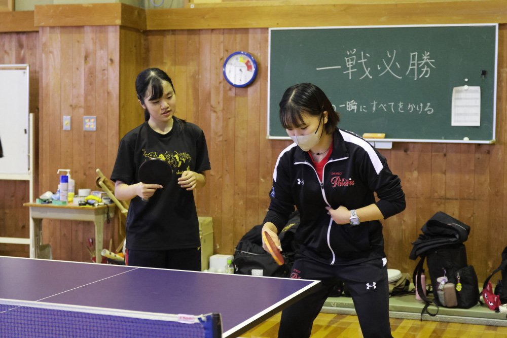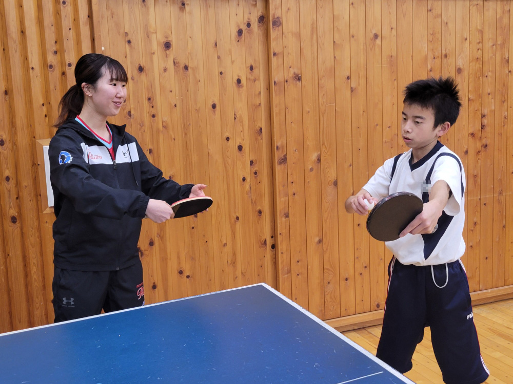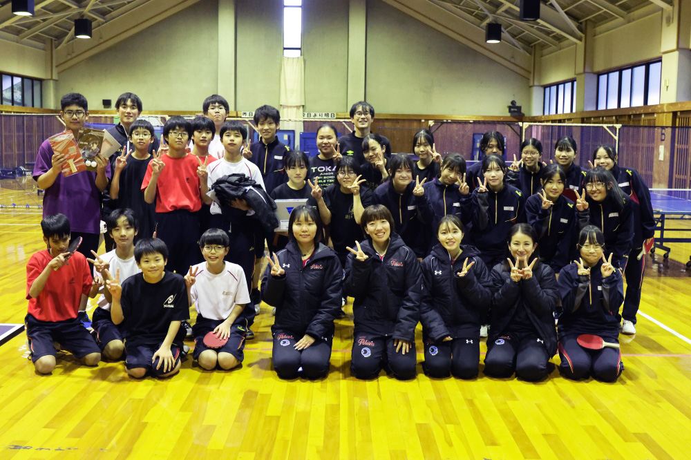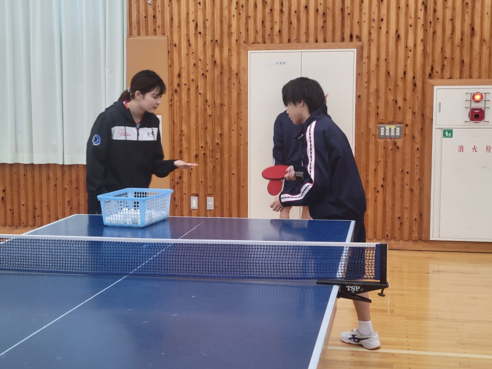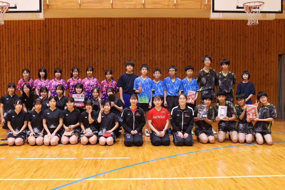 今回は、新居中学校・岡崎中学校・鷲津中学校の卓球部を対象に、基礎技術のポイントやアドバイスを行うほか、生徒から寄せられた技術的な悩みや質問にもお答えしながら指導を進めました。また日本リーグの普及活動とも連携し、卓球メーカー提供の卓球用品(ラケット・ボール)を贈呈いたしました。