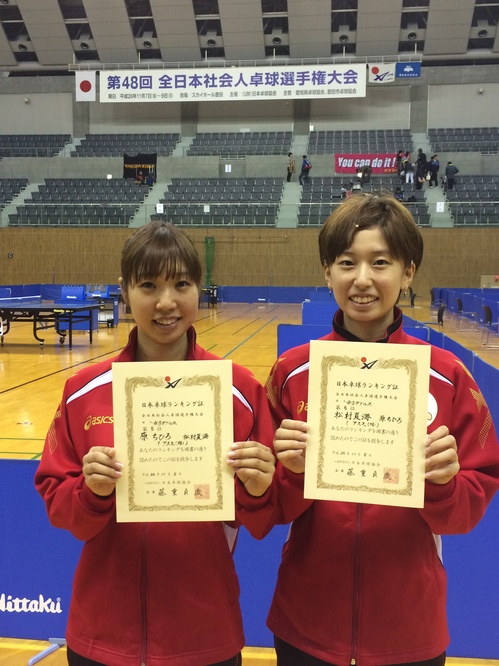 Result 第48回全日本社会人卓球選手権大会 2014.11.09 2014年11月7~9日<ダブルス>原・松村 組 ベスト8(ランク5位)河村・森永 組 ベスト16石塚・平田 組 3回戦敗退 写真 左 原ちひろ 右 松村夏海 <シングルス>河村茉依 ベスト8(ランク6位)原ちひろ ベスト16平田有貴 4回戦敗退石塚美和子 3回戦敗退森永愛里 3回戦敗退松村夏海 3回戦敗退永尾尭子 2回戦敗退 写真 河村 茉依 ダブルスの試合結果はこちらからシングルスの試合結果はこちらから